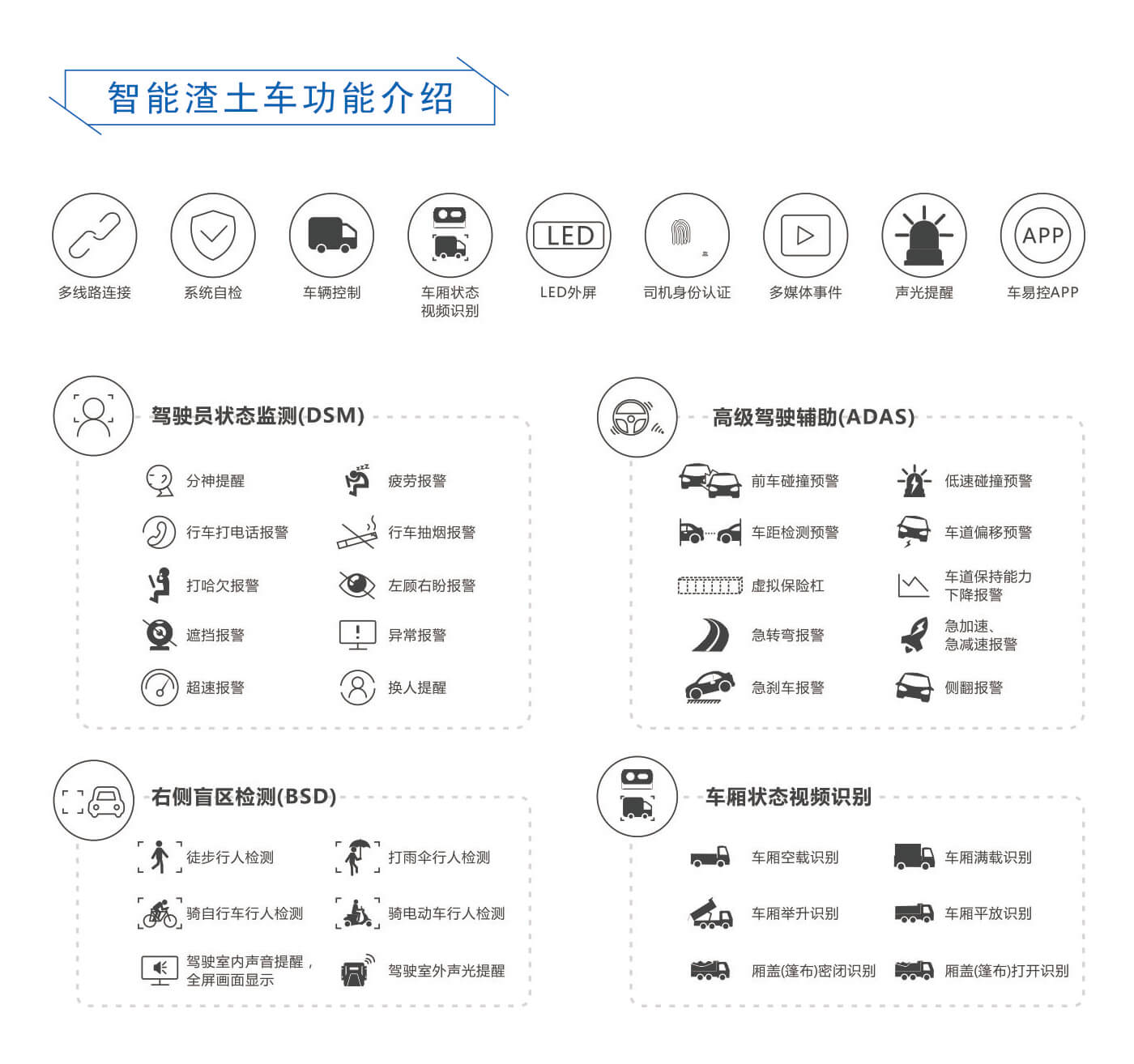 基于ADAS+DSM+BSD+车厢状态识别等智能终端,对渣土车进行全天候、全过程无死角自动监控